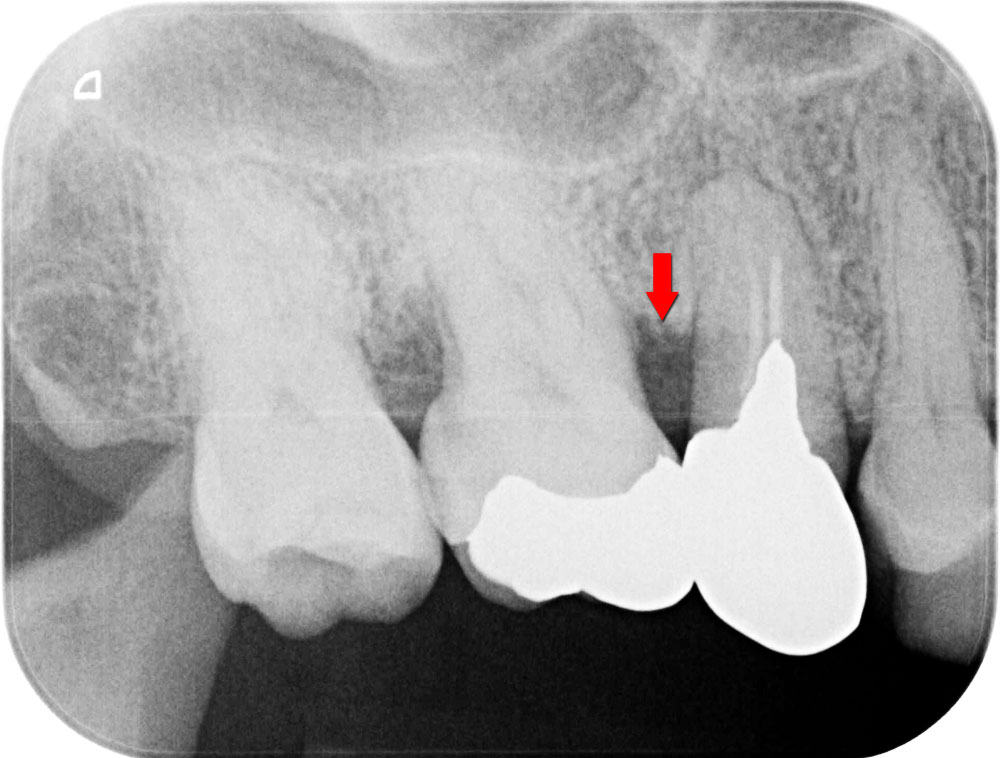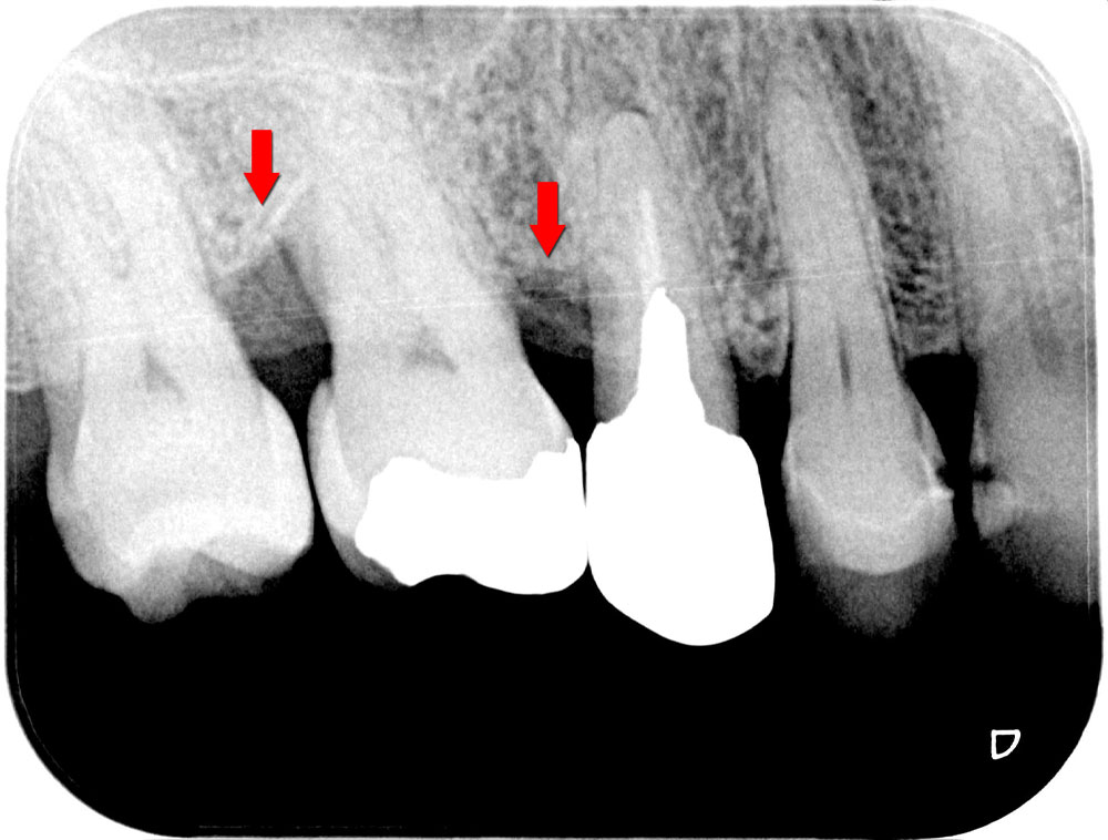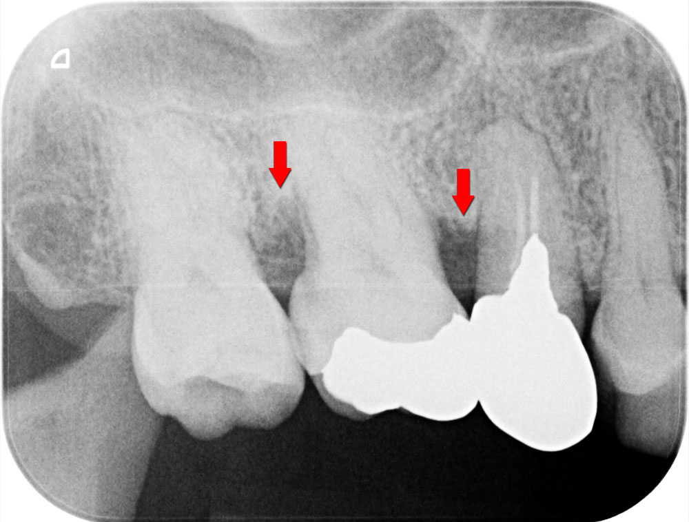 お口全体の徹底した歯石除去をおこないます。その後歯科衛生士による歯ブラシ指導をおこない患者さんのホームケアの質を高めた上で、歯周病の精密検査を行います。基本歯周治療によって歯周病の改善がみられていることを確認のうえ、歯周再生療法に移行します。レントゲン写真の矢印部箇所のように、骨が歯周病により溶けている状態です。