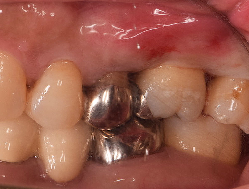 患者さんは40代の女性で、歯がグラグラで噛めないので噛めるようしたいと恵比寿・広尾歯科に来院されました。お口のなかを拝見すると歯周病が進行し特に奥歯の歯周ポケットが深くなり、歯を支える顎の骨が溶けている状況でした。歯ブラシで磨きにくいため汚れが溜まりやすいだけでなく、奥歯は噛み合わせの力が強く加わり歯周病の悪化しやすい歯です。この患者さんも以前、保険の銀歯で治療されていましたが、年々歯がグラグラ(動揺)して噛めないとご来院されました。