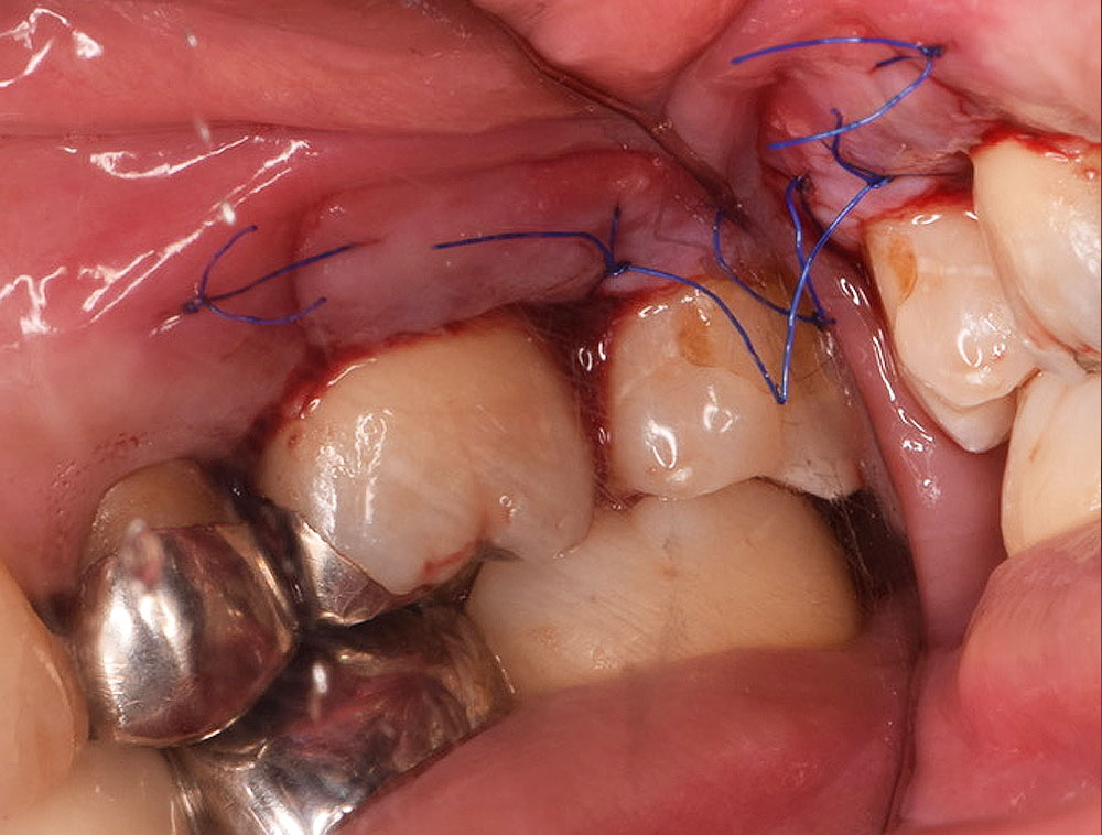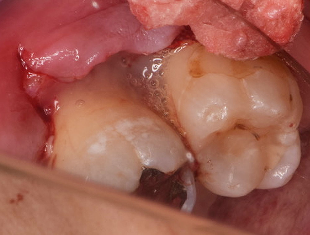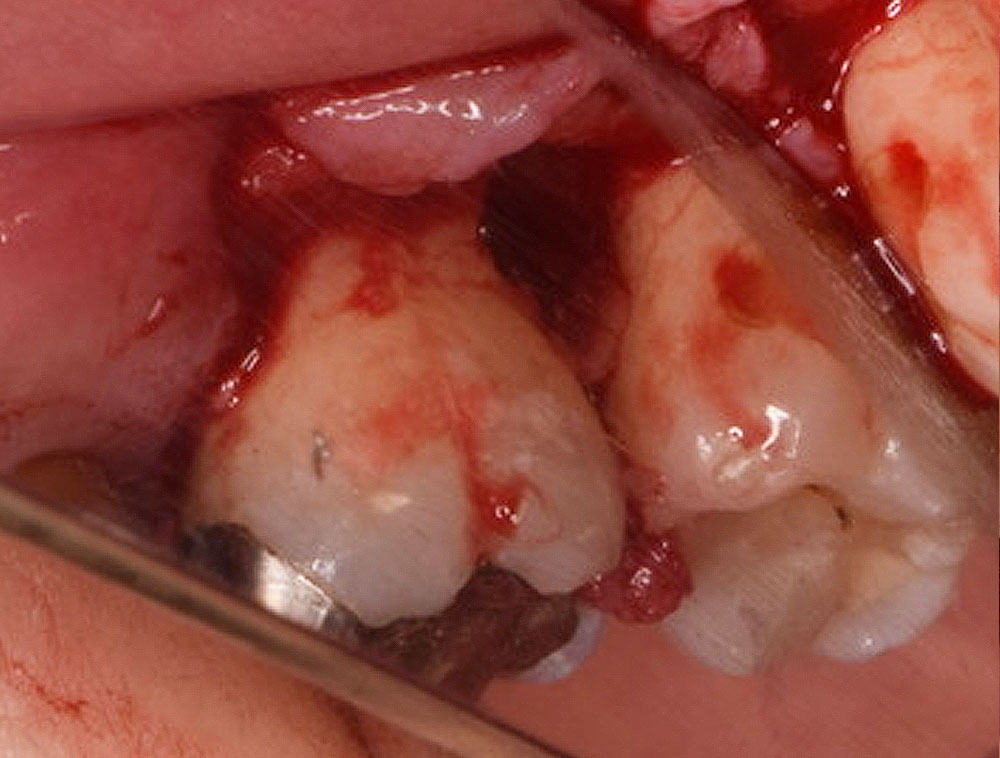 EMD による再生治療は外科的なアプローチをともない行います。まず歯肉を切開・剥離して歯根と歯槽骨を見えやすい状態にします。この状態でそれまで(歯肉縁下の)歯茎に隠れていた歯根先端部についた歯石、歯周病に感染したセメント質を清掃・除去します。